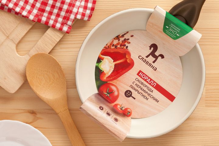 Разработать дизайн упаковки для новой торговой марки посуды для готовки с керамическим покрытием, низкоценового сегмента. Подчеркнуть основные характеристики марки: российское происхождение, традиционность, технологичность, экологичность и семейные ценности.