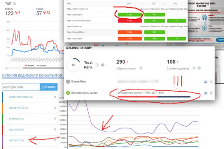 - примерная оценка силы конкурентов: ИКС Яндекса, количество ссылающихся доменов или IP адресов, количество страниц в индексах Яндекса и Google, траст и авторитетность доменов, прогноз числа посетителей из поиска;