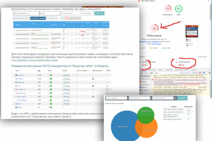 - сравнение с наиболее эффективными конкурентами: авторитетность домена, ИКС индекс качества сайта Яндекса, количество отызвов, быстродействие сайта,