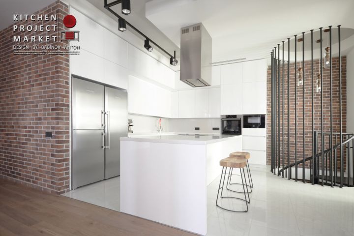 Концепция предполагает расположение основной части бытовой техники в угловой части кухни. При этом, верхняя настенная часть «разбита» на две функциональные зоны: верхний антресольный уровень и нижний, расположенный в основном доступе. Сама L-образная композиция сделана «под потолок». Остров состоит из функциональной части с большим количеством выдвижных элементов, а так же зоны посадки. Рабочая поверхность, при этом, служит и как оперативная обеденная группа, так как основной обеденный стол находится относительно далеко в прилегающей к кухне столовой. Островная вытяжка расположенная над индукционной варочной поверхностью является акцентирующим элементом кухни.
