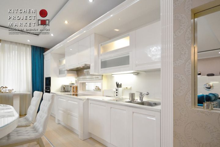 Не смотря на объем и высоту кухня смотрится облегченно как за счет применения глянцевого «Белого» лака в качестве покрытия фасадов, так и за счет открытых декоративных ниш заменивших собой верхний антресольный уровень.