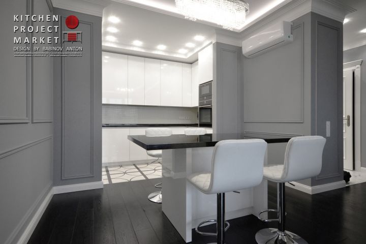 В данном случае речь идет о П-образной кухне совмещенной с гостиной. Решение интересно тем, что композиция «спрятана» от прилегающего помещения за декоративными простенками. Таким образом, кухня «изолирована» от гостиной при соблюдении удобства доступа во внутрь. В центральном проходе на кухню расположен небольшой остров в качестве обеденной группы. Остров реализован в тех же материалах и стилистике, что и основная часть кухни. Посадка реализована под полубарные стулья. При этом, островом можно пользоваться как дополнительной рабочей поверхностью.