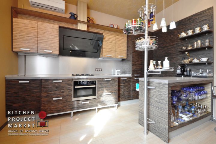 Блок настенных элементов и верхняя открытая зона над вытяжкой выполнены с использованием светлого шпона «Зебрано». В темном «Эбене» выполнено все остальное. При этом рисунок как темных элементов, так и светлых - одинаков, что позволило использовать данную казалось бы несовместимую комбинацию 2-х материалов.