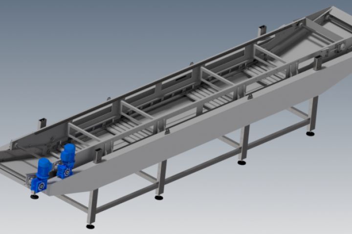 Кусочки рыбы транспортируются в кипящем масле между двумя сетками (транспортным полотном).