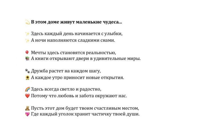 Работа представляет собой создание уникального и вдохновляющего текста для украшения детской комнаты. Текст написан в стиле, который передает атмосферу волшебства, радости и любви, создавая уютную и дружелюбную обстановку. Каждый элемент текста подчеркивает важность мечтаний, открытий и дружбы, делая акцент на значимости любви и заботы в семье. Такой текст может стать прекрасным украшением стен детской комнаты, наполняя ее теплом и светом.
