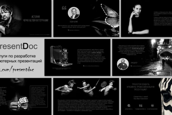 Несколько слайдов очередной презентации, выполненной в #PowerPoint. Её стиль полностью соответствует её теме - "История чёрно-белой фотографии".