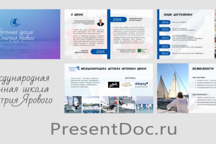 Предполагалось разместить яхтенную (парусную) школу для детей и взрослых в яхт-клубе статусного посёлка. Понимая это, мы осознавали, что презентация не должна быть перенасыщена. И при этом она обязательно должна привлечь внимание и добавить солидности парусной школе. Поэтому главными (ключевыми) слайдами стали слайды об истории школы, её достижениях, возможностях и преимуществах.