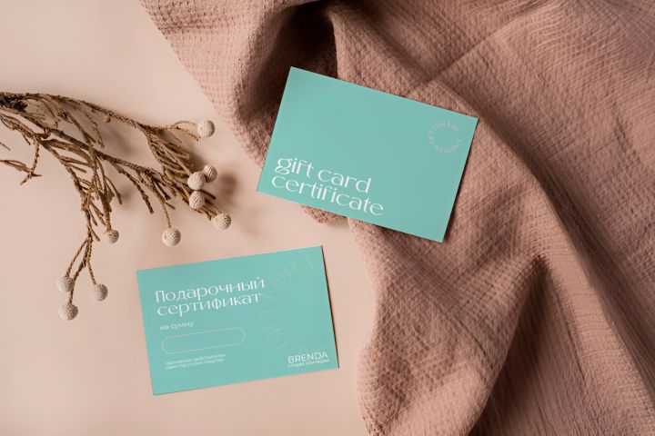 Дизайн подарочных сертификатов для студии эпиляции и массажа "BRENDA". Выполнен в фирменных цветах студии.