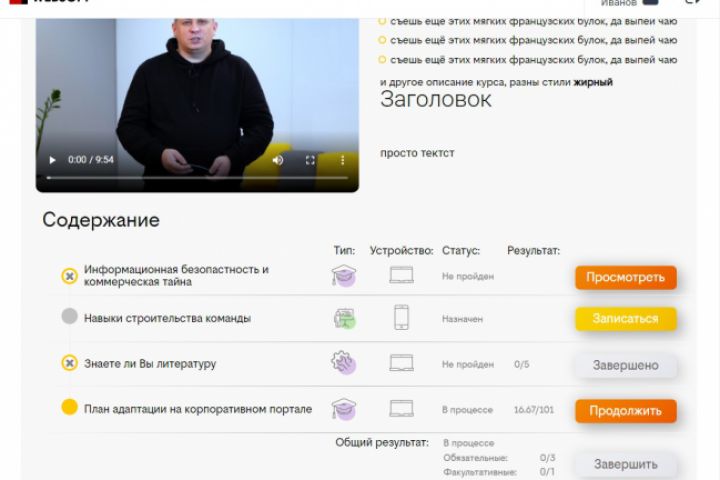 Страница обучающего курса для внутреннего портала Beeline (технология WebTutor от компании WebSoft), страница сверстана по макету в сервисе Figma.