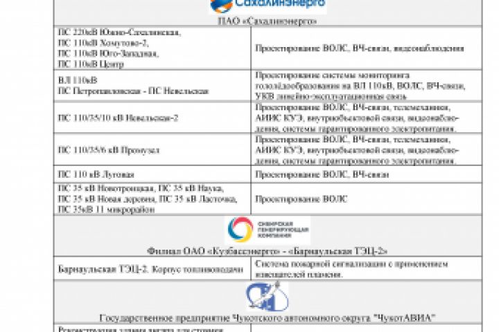 Основные проекты: подстанции 110-35-6кВ, воздушные линий электропередачи, ВОЛС, слаботочные сети жилых и промышленных объектов.