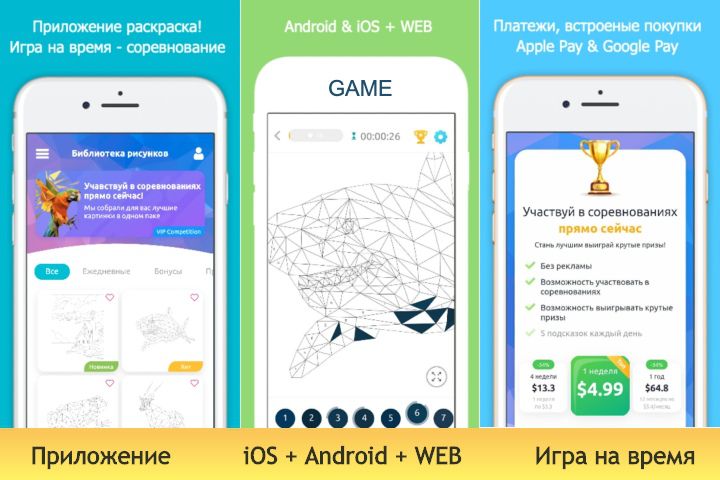 Приложение раскраска для iOS + Android + WEB, игра - соревнование на время, со встроенными платежами через Google Pay & Apple Pay.