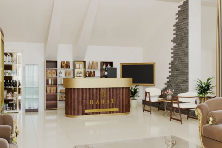 Добавлен ресепшен, полки для бара, маленький столик с 2 стульями, стеклянная кабинка.