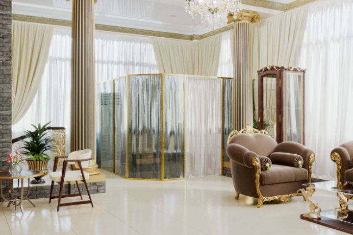 Добавлен ресепшен, полки для бара, маленький столик с 2 стульями, стеклянная кабинка.