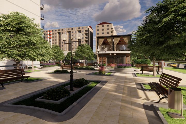 Визуализация ландшафтного дизайна сквера и кафе