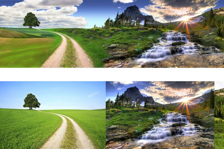 Необходимо было совместить 4 фотографии пейзажа, превратив их в одно пространство на фото, чтобы не оставалось стыков.