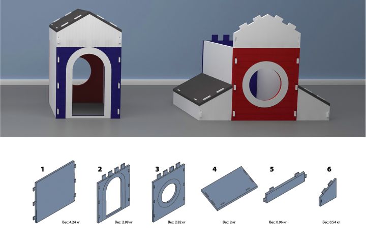 Игровой домик состоит из модулей из мягкого материала EVA. Из модулей получается сложить 4 вида конструкций для игры.