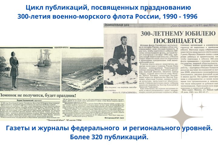 Автор цикла публикаций в печатных и эфирных СМИ, посвященных празднованию 300-летнего юбилея российского военно-морского флота. Свет увидело более