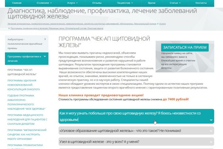 Написание и оформление текста "Программа диагностики щитовидной железы", сайт клиники ПРЕМЕД. HTML-разметка