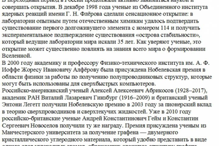 Пример предназначен специально для кичащихся своей безграмотностью и самодурством дилетантов из т. н. "русской википедии". В тексте - "ученые", "Новоселов" (от слова "новосел"), но Алфёров, Флёров (непроверяемые фамилии, чтение которых действительно вызывает вопросы). В качестве бонуса данный пример также дает высоким господам из выкипёдия последний шанс немного подучиться различению длинных и коротких тире.