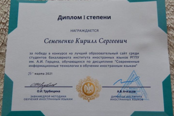 Диплом за победу в конкурсе на лучший образовательный сайт.