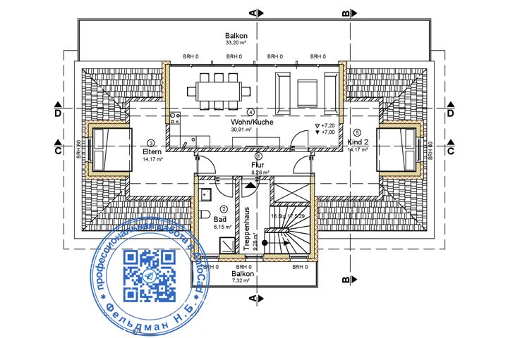 Заказчик предоставил скан, в формате pdf, с размерами этажей 3-х этажного дома в Берлине (здесь представлен только мансардовый этаж).
