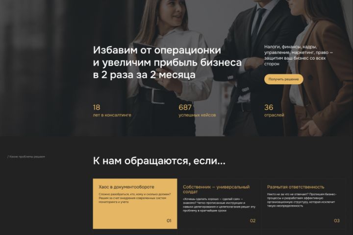После аудита рынка выявили, что конкуренты используют сине-зеленую гамму, поэтому разработали “дорогой” дизайн в темных тонах, чтобы запомниться и отобразить статус компании на рынке. Прописали продающие офферы.