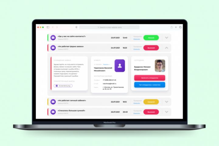 Внутренний интерфейс карточки заявки для администраторов по просмотру заявок сотрудникам с возможностью посмотреть текст обращения, информацию о клиенте, чат с сотрудником, а так же назначить ответственное лицо и изменить приоритет заявки.