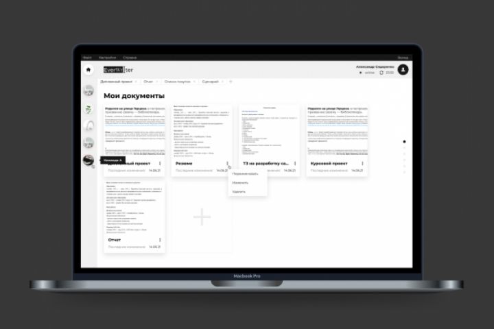 Дизайн интерфейса текстового редактора с возможностью авторизации, добавления и изменения воркплейсов, превью документов, возможностью переключения вкладок и синхронизации документов с сервером.