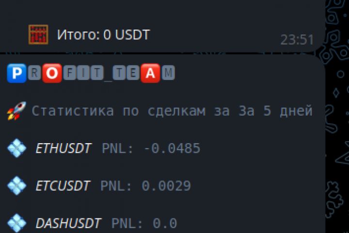 торговый бот Binance, на телеграмме, по вашим сигналам ставит стопы и тейки, и в лонг и в шорт. Если срабатывает тейк стоп подтягивается в безубыток. Ввод размера депозита, статистика, загрузка плечей, В данный момент работает по сигналам из группы, можно потестить работу. @PROFITTEAMBOT