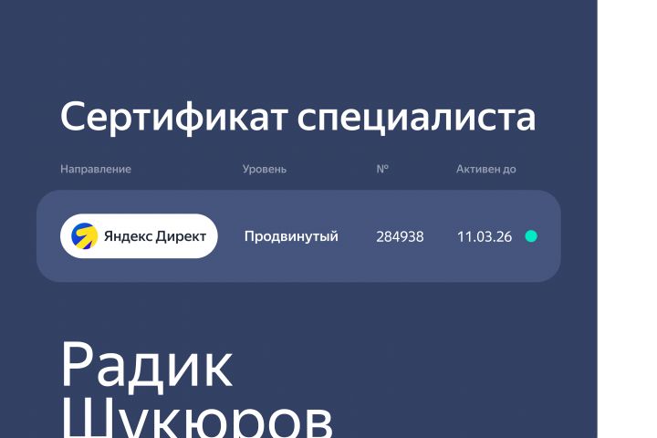 Сертификат подтверждает владение профессиональными навыками рекламы на поиске Яндекса и РСЯ(сайтах партнёров)