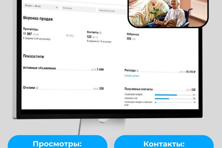Вертикаль: Вакансии. Цель рекламы: на постоянной основе привлекать новых работников для пансионатов Результат: Просмотры - 11987 Контакты - 528 Конверсия - 4,4% Бюджет - 50000