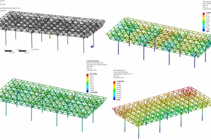 Выполнен расчет на прочность и устойчивость навеса из металлопрофиля размерами 40x14 метров. Расчет проведен с учетом максимальной снеговой нагрузки, характерной для региона размещения.