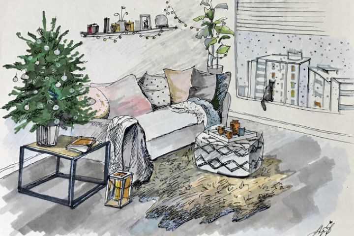 Эскиз интерьера в стиле хюгге. Выполнен скетч маркерами.