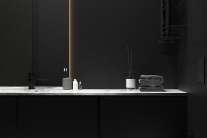 Темный санузел - тренд этого года. Все выполнено достаточно минималистично, также в работе использованы материалы, которые находились на момент (февраль 2022) в наличии в г. Краснодар