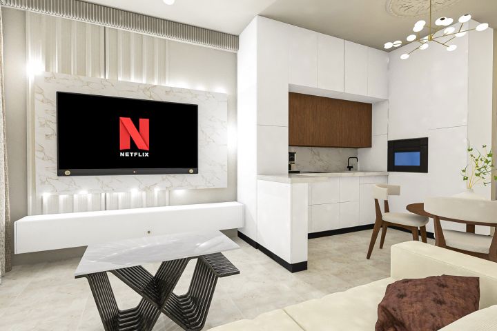 3D визуализация дизайн-интерьера кухни-гостиной