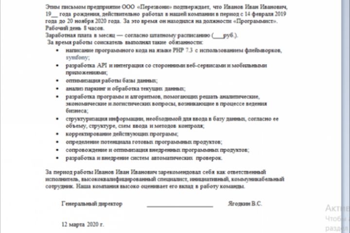 Заказчику необходимо было составить шаблон рекомендательного письма для устройства на работу.