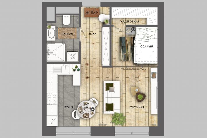 Этот план небольшой квартиры (38 м2) был сделан для женщины, которая планирует жить одна, поэтому спальня небольшая, но благодаря раздвижной перегородке спальня может быть присоединена к основному пространству.