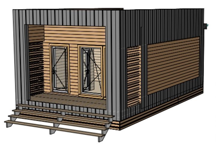 Крыша односкатная, уклон 3 градуса. Фундамент свайный. Чердака нет. Размеры в осях 9х5. Минимальная