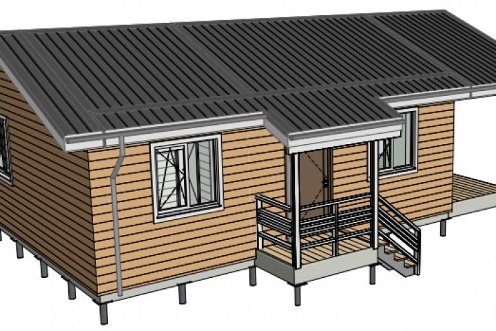 Дом одноэтажный для постоянного проживания. Крыша двухскатная, уклон 20 градусов, отделка - профнастил.