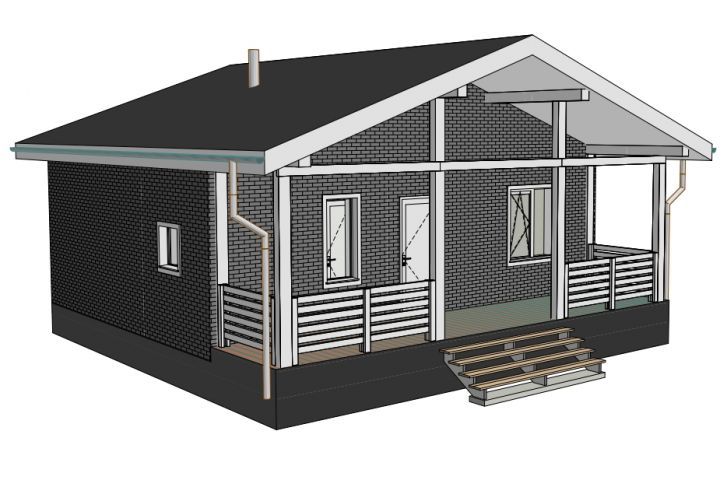 Дом одноэтажный с террасой под одной крышей с домом. Размеры в осях 7х9, + терраса 2м. Без панорамного остекления. Холодный чердак. Фундамент свайный. Спроектирован под доску сухую не строганную. Стены отделаны под кирпич Хауберг, на крыше металлочерепица.