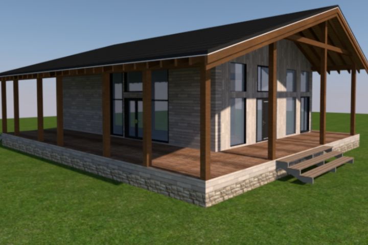 Дом одноэтажный. С панорамными окнами, с большой террасой под общей с домом крышей. Часть помещений со вторым светом, часть с натяжным потолком. Фундамент свайный. Пиломатериал - сухая не строганая доска