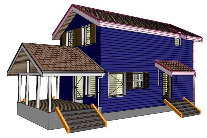 Дом мансардный, без второго света. Три спальни на верху и одна гостевая спальня на первом этаже. Фундамент свайный. Внешняя отделка стен фиброцементный сайдинг. На кровле - мягкая черепица. Расчётный метраж 103 кв.м. Есть мансардное окно , переходящее в окно в стене. Предусмотрено место для камина.