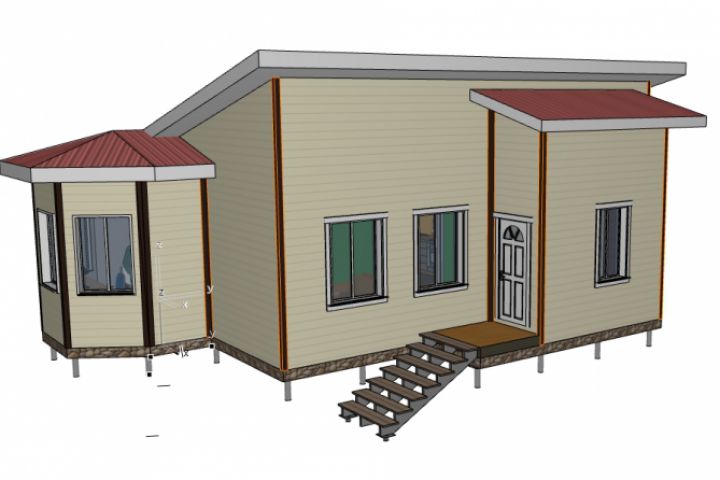 Дом одноэтажный с эркером. На свайном фундаменте. Из сухой не строганной доски. Чердак холодный.