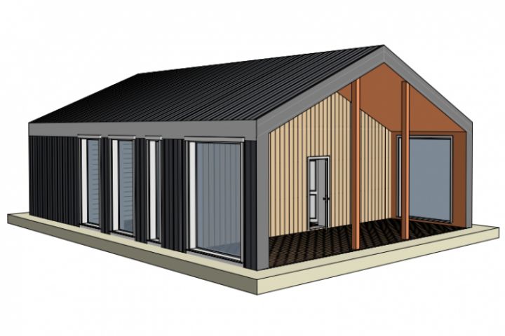 Барн одноэтажный. Фундамент плита. Из сухой строганной доски. Без традиционных панорамных окон на фасаде, так как , в отличие от традиционного Барна,при входе, есть гардеробная и С/У.