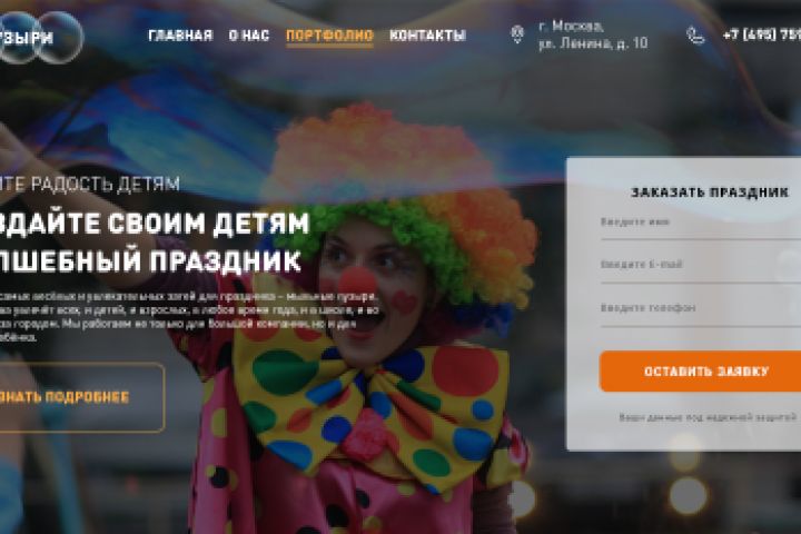 Лендинг сделан для компании Пузыри, которая занимается устройством праздников, с помощью мыльных пузырей. В ходе работы была учтена специфика услуг компании