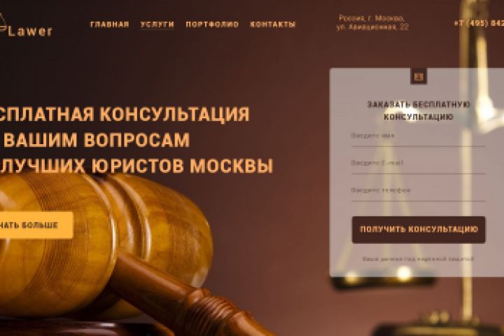 Сайт был создан для юридической фирмы Lawer, оказывающая юридические услуги. В ходе работы была учтена спецификация услуг компании и большой акцент сделан на возможности пройти бесплатную консультацию