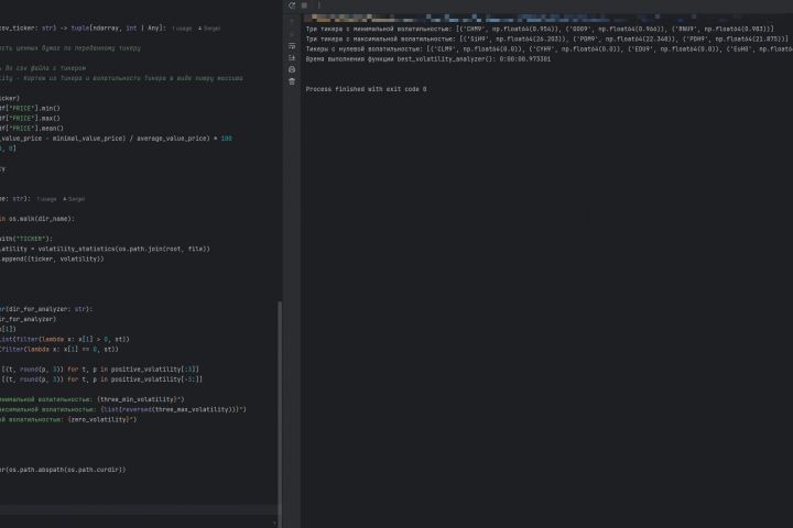 Необходимо было по данными ценных бумаг из табличных значений в виде csv-файла провести расчеты волатильности ценных бумаг и вывести результаты анализа по 3-м ценным бумагам с самой высокой волатильностью, 3-м с самой низкой волатильностью и всем ценным бумагам с нулевой волатильностью