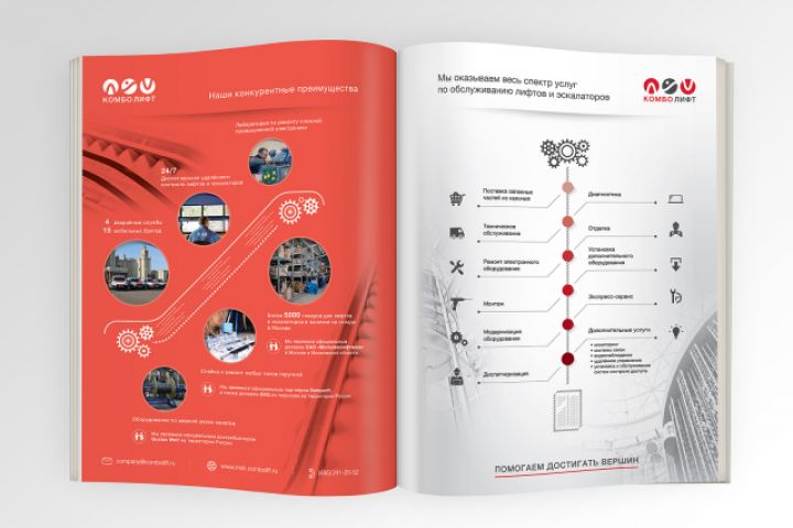 Рекламный разворот для журнала компании "Комболифт". Поставка, монтаж, обслуживание, продажа комплектующих для лифтов, эскалаторов, подъемников.