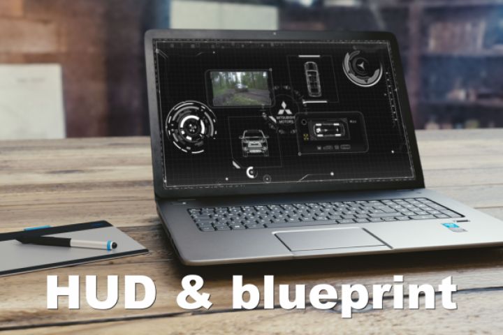 Для вдохновения мне прислали картинку с чертежами. Это всё, что заказчик мог предоставить. Именно это и натолкнуло на мысль, что здесь идеальным решением будет создание HUD и blueprint, поскольку основа для схем у нас уже есть, нужно её доработать до требуемого «состояния». Выбрав вид сверху для основного шота, я «вырезал» ненужный салон автомобиля и дорисовал двигатель, подвеску и прочие детали. Остальное было делом техники.