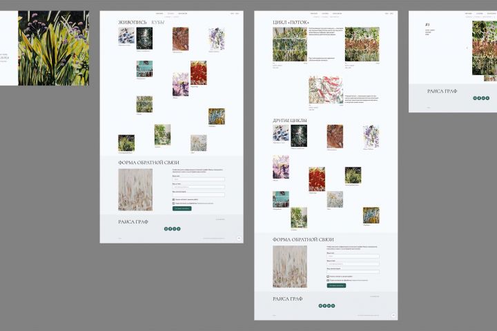 Был выполнен многостраничный сайт художницы. Запрос: минималистичность, лаконичность, чтобы были видны картины, а также создание адаптивов и английской версии. В результате обсуждений и просмотра рефересов было решено сделать «плавающую» структуру картин, чтобы добавить легкости.